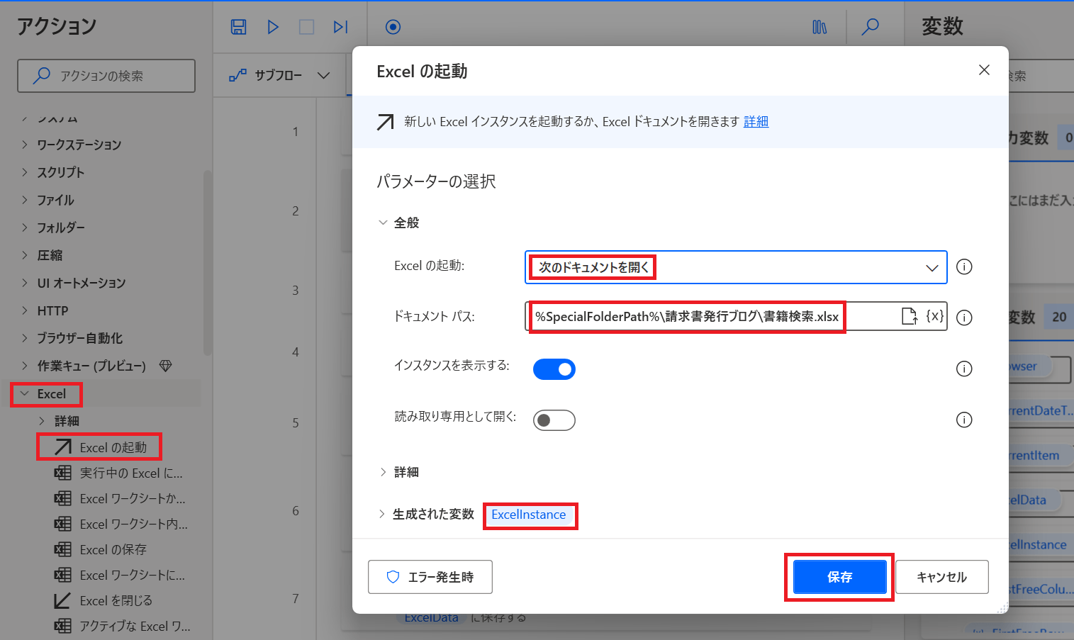 2)Excelの起動 Power Automate for Desktop X Facebook はてブ LINE 2023.08.31 2)Excelの起動 Excel → Excelの起動 → Excelの起動 :「次のドキュメントを開く」 → ドキュメントパス :「%SpecialFolderPath%\請求書発行ブログ\書籍検索.xlsx」と書き換えます → 生成された変数 :「%ExcelInstance%」を確認します。 → 「保存」ボタンをクリックします 関連