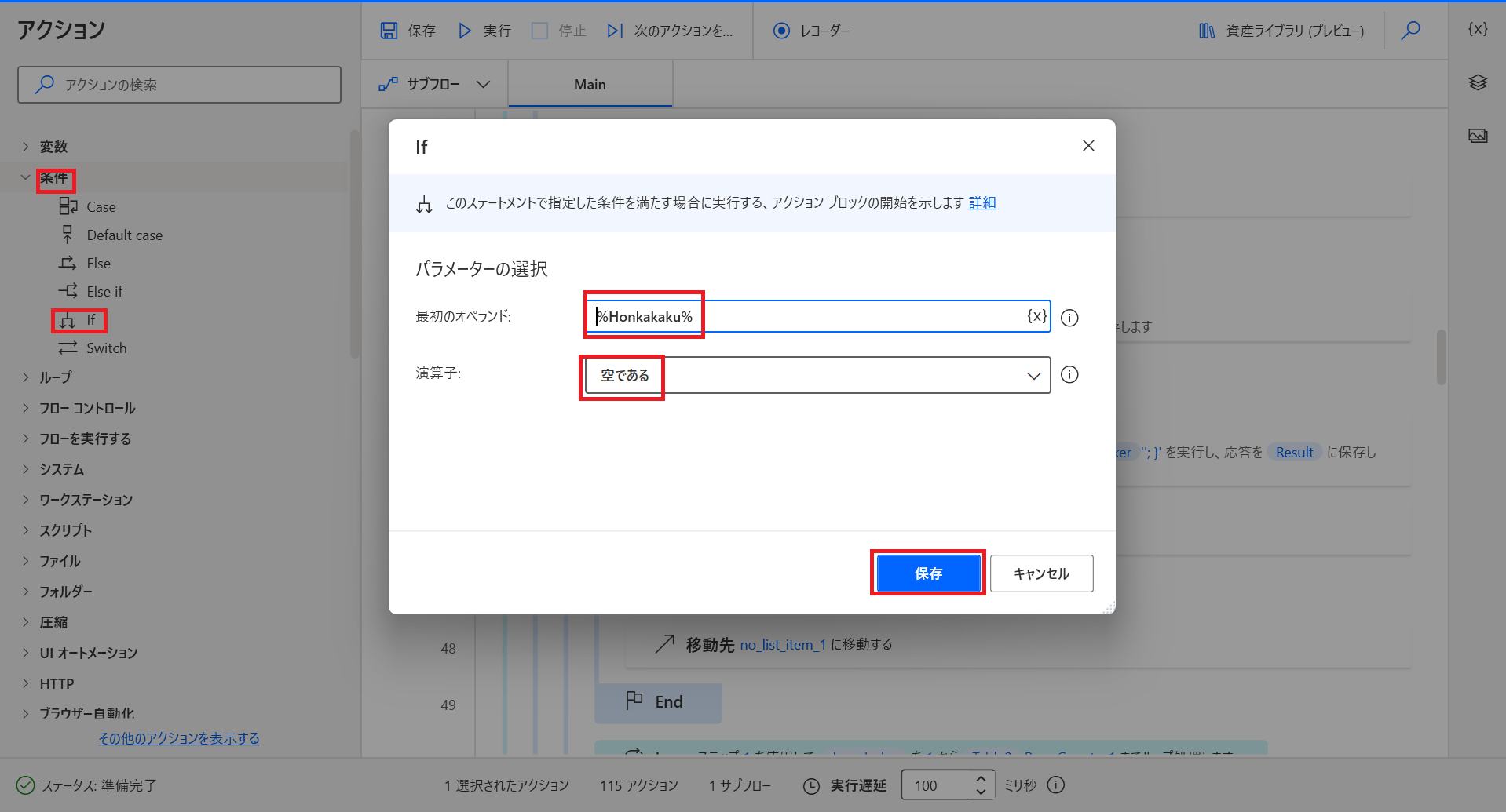 42)If ~ 66)End Power Automate for Desktop X Facebook はてブ LINE 2023.09.01 42)If ~ 66)End 条件 → If → 最初のオペラント :「%Honkakaku%」 → 演算子 :「空である」 → 「保存」をクリックします 関連