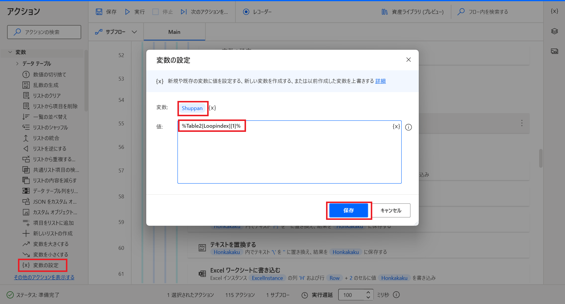 55)変数の設定 Power Automate for Desktop X Facebook はてブ LINE 2023.09.08 55)変数の設定 変数 → 変数の設定 → 値:「Table2[Loopindex][1]%」を入力します → 変数:「%Shuppan%」を確認します → 「保存」をクリックします 関連