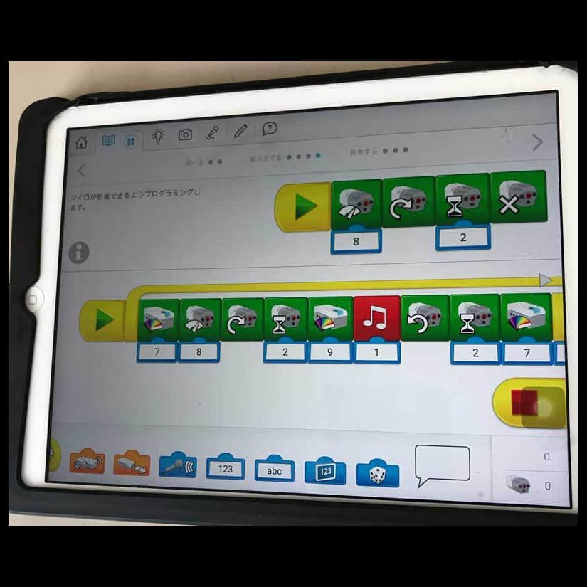 Microbit 初期には基本的な使い方 音楽とRGB LEDの点灯 ボタン操作 超音波センサーの利用(拡張基盤に電源が必要) 温度、光、音センサーの確認など コード練習開始。家にあるダイアルで調整できるものを探す宿題が出されました。 Microbitキットの学習が行われ、Javascriptに興味を示す。 |