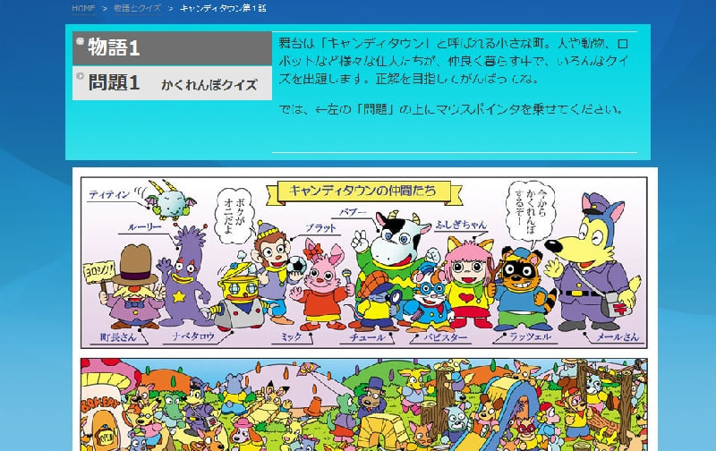 舞台は「キャンディタウン」と呼ばれる小さな町。人や動物、ロボットなど様々な住人たちが、仲良く暮らす中で、いろんなクイズを出題します。正解を目指してがんばってね。